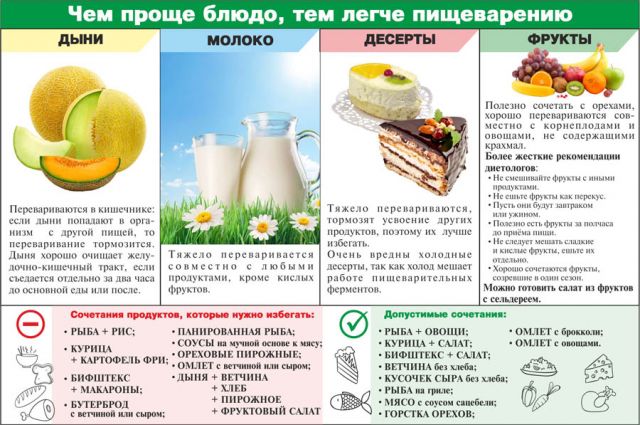 Полезно употреблять за один прием продукты питания с одинаковым временем переваривания. И только после полного усвоения полученных организмом питательных веществ, приниматься за следующий прием поглощения еды. Рацион, который содержит смешанные продукты с разным временем переваривания, приводит к «захламлению» ЖКТ, так как одни продукты уже усвоились, а другие еще не переварились.