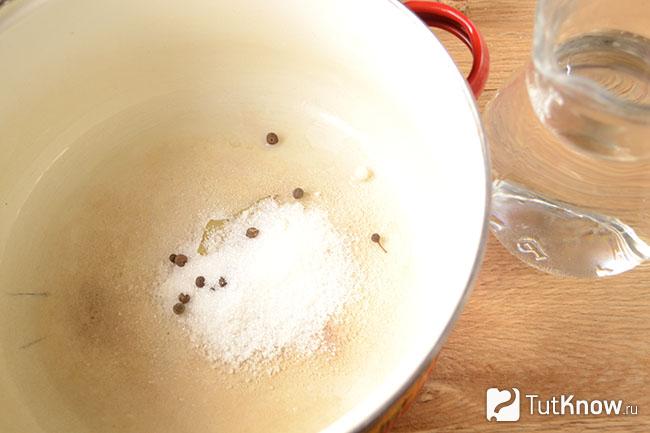 - В отдельной емкости сварите маринад – в два литра воды выложите все необходимые компоненты, которые перечислены в рецептуре, после закипания варите 5 минут.