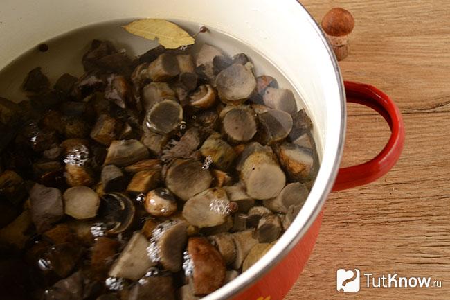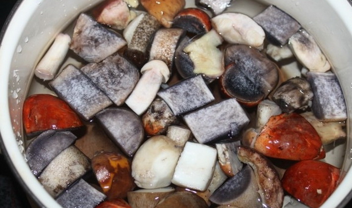 - Погружают в ёмкость для отваривания, заполняют водой и добавляют щепотку лимонной кислоты, это поможет грибам сохранить свой цвет.