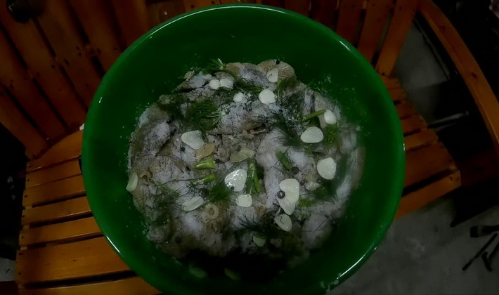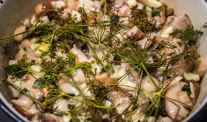 - Половину специй с зеленью выкладываем на дно кастрюли, затем высыпаем все грибы, посыпаем солью, выкладываем оставшуюся половину специй и зелени, сверху стелем лист хрена. Поверх кладем тарелку с каким-либо грузом и оставляем на 5-6 дней.