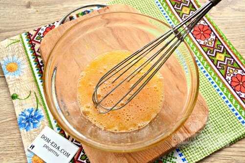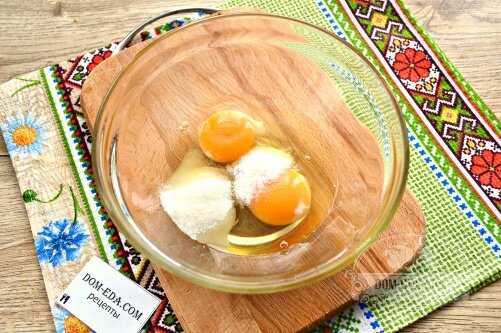 - В миску разбейте яйца и добавьте к ним сахар. Взбейте с помощью вилки.