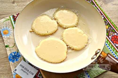 - Готовое тесто с помощью ложки вылить на сковороду и обжаривать оладьи до готовности с каждой стороны по три минуты.