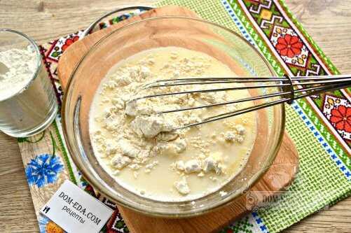 - Теперь всыпьте муку и заместите тесто, чтобы оно напоминало хорошую домашнюю сметану (по густоте). Следите, чтобы не получались комочки.